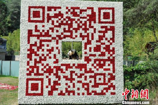 由云南野生动物园明星大熊猫思嘉在鲜花二维码正中央摆pose。 杨华伟 摄