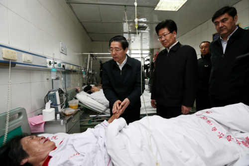 郭声琨来到自治区人民医院,看望慰问受伤群众,转达了习近平总书记、李克强总理的亲切关怀和问候。他走进病房,在病床前详细询问受伤群众伤情,安慰他们安心治疗,表示将坚决打击暴恐犯罪,给人民群众一个负责任的交代。他叮嘱有关部门和医护人员,要调集医疗专家和医疗资源,想方设法、千方百计全力救治受伤群众,不惜代价挽救生命。郭声琨还向遇难群众表示沉痛哀悼,要求认真细致地做好受伤人员和遇难者家庭的安抚救助工作,妥善处理遇难者善后事宜,帮助群众解决好实际困难。