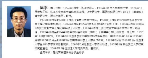 据浙江大学官网显示,吴平,男,汉族,1957年3月生,浙江杭州人,1986年7月加入中国共产党,1976年10月参加工作,浙江农业大学土壤化学系本科、硕士研究生,国际水稻研究所(IRRI)(菲律宾)博士研究生,研究生学历,教授。