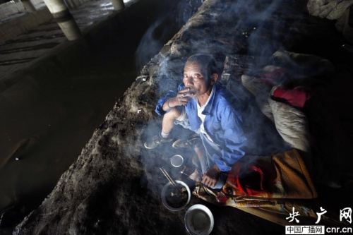 在宁波一处桥洞下,过往的车辆卷起了尘埃,路人无不掩鼻而行,匆匆离开。而在桥洞上方,一位光着上身、皮肤黝黑的老汉却怡然自得,吃着鸡块、喝着老酒,吸引让过往路人驻足观看。