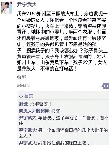 这条微信发出后,在朋友圈很快地引起了关注。网友@恋爱的悟空看到后,将消息发在了微博上:“一位朋友@尹宁武大发现一可疑女子怀抱婴儿,经交谈怀疑是人贩子。时间紧迫,大家有什么办法都说一下。求扩散,或许婴儿父母可以看到!”