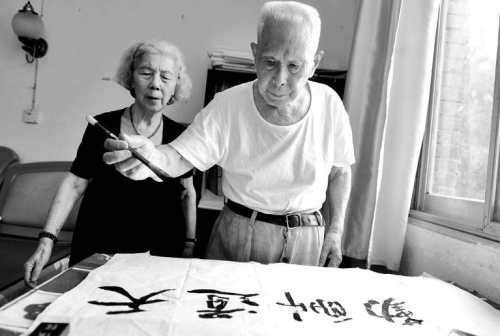 在钟祥一中一栋老宿舍楼内,104岁的退休教师邓承先正在从事书法创作,“天道酬勤”四个大字遒劲有力。86岁的夫人张铭素在一旁为他磨墨。对于自己的长寿秘诀,邓老认为是“多动”,多动手,多动脑,外加心胸开阔。