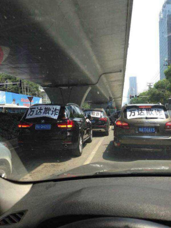 一排豪车后窗玻璃上贴着如上标语,缓缓驶入武汉万达汉街销售部,现场还拉起了“万达管理乱,迟早要完蛋”的白底黑字横幅。