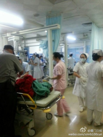 厦门日报记者石雯祺跟进报道:中医院急诊室护士说,之前伤者都挤在急诊室,现在每个科室几乎都有了,大概有二三十人。记者看到,有人烧伤很严重,多人被送进脑外科。