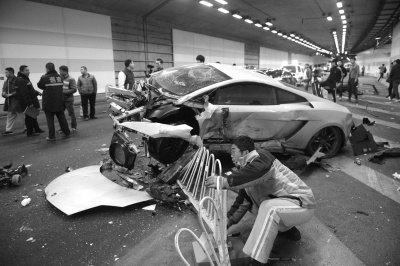 4月11日晚,在大屯路隧道内,一辆红色法拉利跑车和一辆绿色兰博基尼跑车与隧道墙壁和道路护栏发生碰撞,两车严重损坏。一名女性受伤。