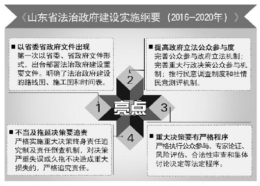 5月31日,山东省历史上第一次以省委、省政府文件形式出台《刚要》,明确了山东省法治政府建设的“路线图”、“施工图”和时间表。据记者了解,此做法在全国尚属首例。