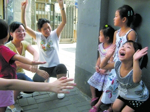 5分钟后,游戏小组来到了一个小区门前,四层红砖楼遮住了阳光,辟出了一片阴凉。刘莉站在学生中,抬手指向记者说:“大家跟这位老师介绍一下自己是哪里人?今年几岁了?”一个小胖子立刻举起手说,“我5岁了,我是北京人。”他的介绍引起了孩子的追捧,“我也是北京人”、“我也是”、“我们都是北京人”……“他们说的都是普通话,很多孩子都在北京出生,他们已经把自己当成了北京人。”刘莉解释说。