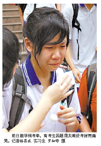 昨天,广东高考进行了文科/理科综合及英语科的考试。继前天理科数学考哭考生后,昨日理综也让不少学生大喊“杯具”。昨天上午,执信中学考场考生陆续入场,门口送考家长讨论起前天下午的数学题,难度过高成为共同话题,“昨晚看孩子表情就知道考得不好,又不敢问,不知试题难还是他发挥不好”。109中学的老师第一时间给家长发短信:“普遍反映偏难,请家长注意打电话发短信安慰考生。”培正中学也群发短信给家长,请家长适时劝导考生。