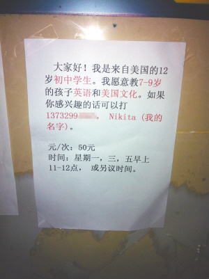 “大家好,我是来自美国的12岁初中学生。我愿意教7至9岁的孩子英语……”7月6日,张贴在南昌红谷滩新区滨江豪园小区一栋的一则“招生”广告引起了居民注意。12岁的孩子就有当家庭教师的意愿?7月10日,记者联系并采访了这则广告的张贴者——12岁的美国小女孩Nikita。