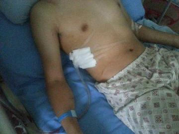 据当晚为朱老师治疗的泸医附院唐医生介绍,朱老师送来时照的CT显示胸腔内有积液,目前正在用仪器将胸腔内的血水导出来。“目前还正在观察中,如果24小时还有活动性出血,里面凝固血块比较多,就只有开胸。但从目前来看,病人病情还比较平稳。”