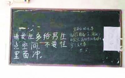 记者微访(史凤玲 通讯员王鹏程 李小霞)“请女生们多给男生点空间,不要往里面冲”——宿管阿姨一语惊人。王同学是汉口学院管理学院大一的学生,他说,在学校一栋宿舍一楼的一块黑板上,写着以上内容。