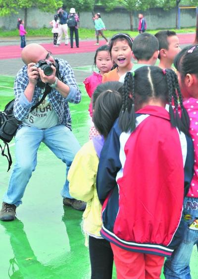 来自尼泊尔的爱心志愿者卢山和泰鹏是同济医学院的留学生,为给甘棠小学的留守儿童拍照片,两人清晨6时就起床了,早早赶到本报集合地点。