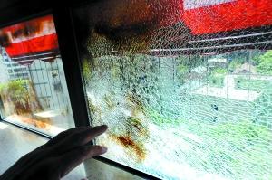 玻璃窗上依旧有过火痕迹,右下角的那块玻璃碎裂情况最为严重。