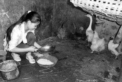 “种地喂鸡鸭,是最简单的事。”说起自己养的鸡鸭,阳治滔滔不绝,“这只唯一的鹅,是去年我生日的时候,舅舅送给我的生日礼物。”阳治喂的鸡鸭,平时舍不得吃,只有等哥哥放月假或者父母过年回家才杀了“打牙祭”。周末和哥哥放月假的时候,阳治和哥哥阳杰就会去地里干活。“等爸妈过年回家的时候,家里吃的穿的什么都有,家也就像一个家了。”阳治说。