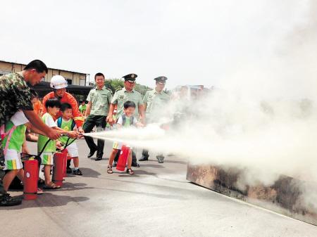 消防官兵手把手教孩子们使用灭火器。田效金 摄