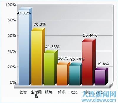 记者通过网络问卷的方式随机在驻连12所高校中选取了101名大学生,针对他们在连每月消费现状作了调查,结果显示,仅有2.97%的人月生活费在600元以下。每月生活费消费800元到1000元的占36.63%,消费1000元至1500元占25.74%。而生活费的用处,除了每日三餐之外,主要用于购买生活用品(70.3%)、缴纳手机话费(56.44%)、购置衣服(41.58%)、娱乐(26.73%)、社交(25.74%)等方面。同时,记者还发现,单纯用于一日三餐的花费中,有36.63%的大学生定位在600元以下,40.59%的大学生定位在600元到800元这个区间,18.81%的大学生定位在800元到1000元。多名大学生表示,如果节俭一点的话,一个月800元是够花的。