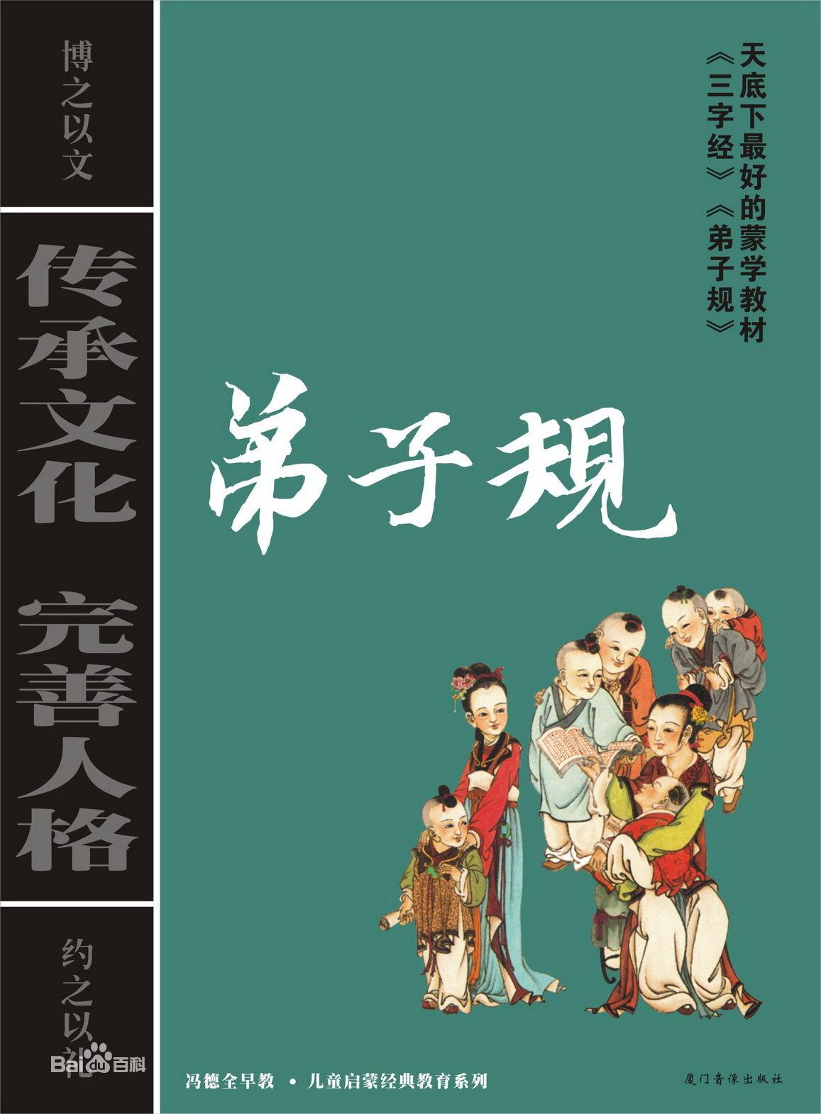 《弟子规》原名《训蒙文》,为清朝康熙年间秀才李毓秀所作,其内容采用《论语》“学而篇”第六条的文义,列述弟子在家、出外、待人、接物与学习上应该恪守的守则规范。《弟子规》共有360句、1080个字,三字一句,两句或四句连意,和仄押韵,朗朗上口;全篇先为“总叙”,然后分为“入则孝、出则悌、谨、信、泛爱众、亲仁、余力学文”七个部分。《弟子规》根据《论语》等经典编写而成,集孔孟等圣贤的道德教育之大成,提传统道德教育著作之纲领,是接受伦理道德教育、养成有德有才之人的最佳读物。