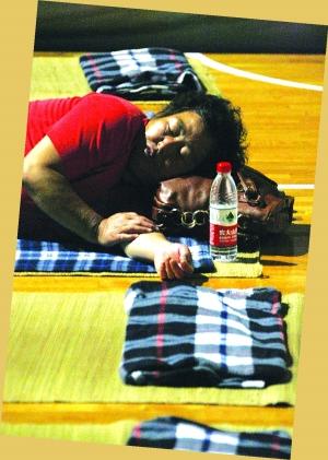 累了一天,家长在体育馆里打地铺