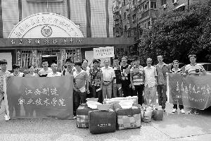 昨日,在南昌慈善义工协会楼下,参与第三届支教活动的大学生们拿着棉被、脸盆等行李,等候着出发。