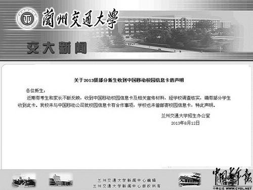 然而,戏剧性的是,8月12日,兰州交通大学招生办公室在该校官网刊登了“关于2013级部分新生收到中国移动校园信息卡的声明”。声明指出:“近期有考生和家长不断反映,收到中国移动校园信息卡及相关宣传材料,经学校调查核实,确有部分学生收到此卡。我校未与中国移动公司就校园信息卡有合作事项,学校也未曾邮寄校园信息卡。”