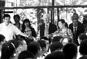 活动现场,北京汇文中学的三名学生代表就他们所关心的问题与詹姆斯·莫利斯进行了探讨。昨天恰逢教师节,一位学生问道:“在您的人生经历中,哪位老师给您的影响最深、引领您走向成功?”詹姆斯·莫利斯说,许多老师都在他人生发展的不同阶段给予过不同类型的帮助,比如他在上中学时遇到的数学老师,让他对数学这门学科产生了浓厚的兴趣,内心中收获了自信。还有八岁时教他弹钢琴的音乐老师,引领他踏进艺术之门,懂得用欣赏美的眼光去看待世界。“不同的老师会给我们的人生带来不同的启迪。最为重要的是,给我印象最深、帮助最大的老师,恰恰是那些让我始终抱有对学习的兴趣,能够鼓励我克服重重困难的人,这样的老师让我一辈子铭记。”