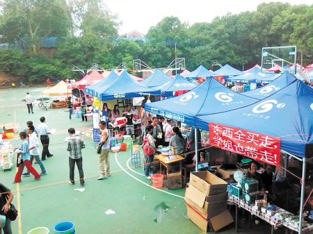 “同学,要不要买水瓶、塑料盆?”“最后一天便宜卖便宜卖啦,来看看吧!”在中南大学南校区操场内,招徕声此起彼伏。这里纵横交错地摆了几十个棚架,过道上人来人往,形成了一个热闹非凡的商贸市场。市场内各种货物堆积如山,床单、衣架、塑料盆、热水瓶等生活用品一应俱全,而“摊主”绝大多数都是在校学生。其中做得最大的一个团队,四个人开了五个“分店”,三天中营业额突破5万元,让其他摊主直呼“羡慕嫉妒恨”。