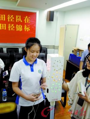 福田中学高三女生陈佳和她发明的“智能式感应红绿灯”。