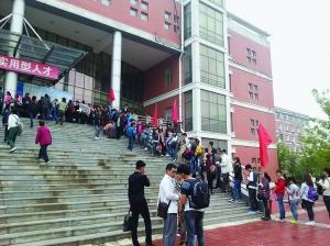 12时许,在学校图书馆外,记者看到等待交费的学生排起了“长龙”,很多家长在陪着孩子。图书馆门外的空地成了家长们的聚集地,记者注意到,大约有四、五十位家长在门口翘首等待,他们的目光都投向一个方向——设在图书馆内的交费大厅。