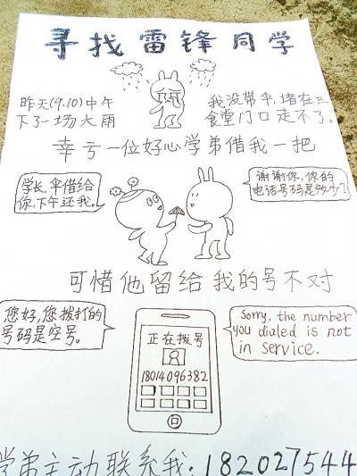 好心人雨天借伞,想归还却发现对方留的电话是“空号”。中国地质大学研一学生卯江明画了一张“寻找雷锋启事”,“萌意”十足。