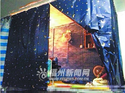 昨日,记者联系上了床铺的主人福建农林大学东方学院电子信息专业的陈亮同学,他自称是“贤惠的惠安汉子”。陈亮告诉记者,他的宿舍是8人间,每个人的私人空间只有这个宽1.2米、长2米、高1.5米的床铺,为了让生活过得更舒适,他决定在自己的“一亩三分地上”DIY一番。“其实我这个床铺改造计划都是自己动手做的,真正的成本还不到100元。”他告诉记者,挂床帘既美观,又可在夜间开灯时不影响舍友休息。大部分材料是通过网购而来,而壁纸是从学校文具店买来图纸一张张贴上去的,颇费一番功夫。