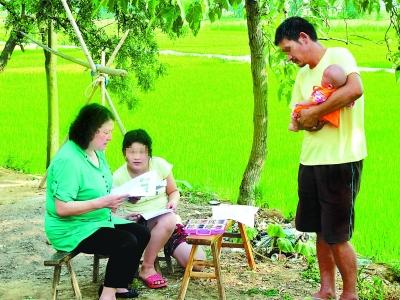 图片说明:刘凤琴在对思思(左二)做心理疏导,爸爸李春生很关心女儿的状况,抱着“小小孩”在一旁驻听