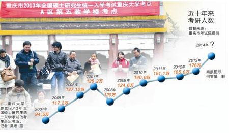 2014年全国硕士研究生招生考试,10月10日正式报名。尽管从2014年秋季起读研全自费,但商报记者调查发现,考研依然备受追捧。而重庆市考试院提供的数据显示,全国研究生报考人数已连续9年达百万人以上,连续四年以超过10万人的速度递增。