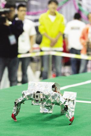 这边,小巧可爱的舞蹈机器人用精彩的表演征服了观众;那边,一场场机器人之间的“肉搏战”更是引来观众一阵阵喝彩。在约4平方米的擂台上,一大一小两个机器人都穿上了厚厚的“铠甲”,起初彼此在台上不断互相“挑衅”,只是试探性地碰几下,并不贴身“肉搏”。过了一会儿,大个机器人突然向小个机器人碾过去,小个机器人佯装往前硬顶,但当两者刚一接触,小个机器人便灵巧地一扭,绕到了对手身后,顺势鼓足劲向前顶,结果大个机器人一下子被挤到擂台边缘摔了下去。之后,获胜的小个机器人回到擂台中央,不断转圈庆祝胜利,随后上台挑战的三个机器人无一例外地都被这个灵巧的“小个子”打败,引来台下一片喝彩声。