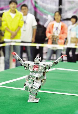 随着《江南style》动感的音乐响起,一个叫“宝儿”的宝蓝色小机器人开始有节奏地舞动起来,经典的“骑马舞”姿势,比“鸟叔”的舞蹈多了些可爱,显得特别“萌”,让在场的师生忍不住笑起来,而当“他”在做一些看起来有些危险的动作时,如金鸡独立,往往会让人捏一把汗……这是昨日在天津工业大学举行的“天津市第一届大学生机器人大赛”上的一幕。此次比赛分6类——舞蹈类、对抗类、球类、田径类、创意类和仿真赛,包括拳击、武术擂台、击剑、足球等15个项目。本市有工大、科大、师大、理工等8所高校参加,参赛的机器人都是由学生根据大赛要求自己组装并编程。