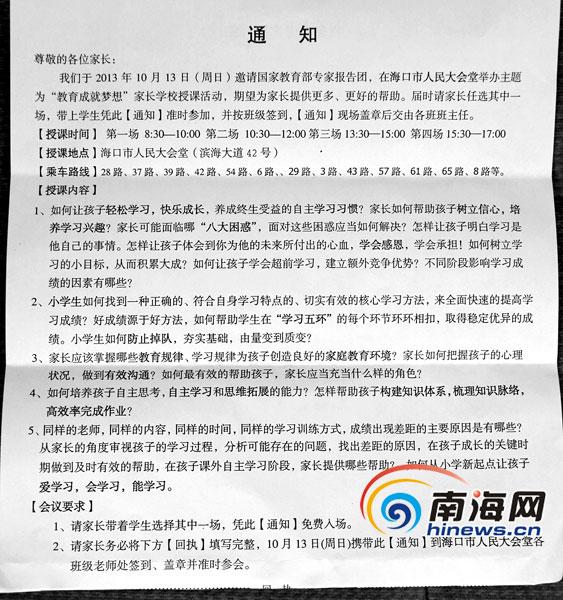 记者在现场了解到,海口市滨海九小、海口市第二十五小学、海口市第十一小学、海口寰岛实验小学、海口市英才小学均有大批家长持孩子从学校带回来的《通知》来听报告会。