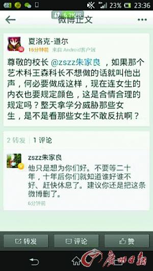 记者搜索发现,有学生于15日晚上在微博吐槽此事,并@了该学校的校长。随后,微博认证为中山市某学校校长朱家良的微博网友“ZSZZ朱家良”在微博上回复学生称:“他只是想为你们好。不要等二十年,十年后你们就知道谁好谁不好、赶快休息了。建议你还是把这条微博删了。”