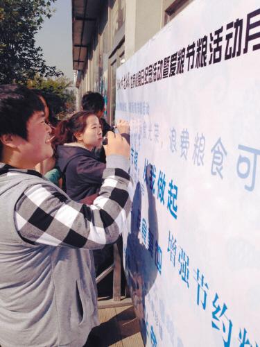 在沈师食堂门外,一张“2013年世界粮食日纪念活动暨爱粮节粮活动月”宣传板上,很多同学签上了自己的名字。“在学校食堂吃饭时,你可曾将没吃完的食物倒掉?也许在你心中觉得浪费一点点粮食根本就算不上什么,但按全国大专以上在校生总数量2860万人计算,大学生们每年倒掉的食物可养活大约1000万人生活一年。”粮食学院特意为大学生们算了一笔账,以此叮嘱他们珍惜粮食。