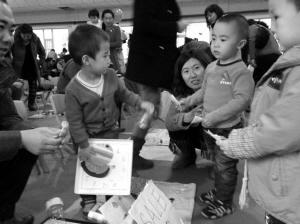 跳蚤市场的一家布偶摊卖得非常火,用旧袜子缝制成的6个兔娃娃吸引了很多小朋友们来买,不一会儿功夫,5个兔娃娃被买走了,数着自己手里赚到的300块“钱”(注:幼儿园专门为孩子们提供的游戏币),琳琳美滋滋的。“这些兔娃娃都是姥姥用家里的旧袜子做的,60块‘钱’一个,不能再便宜了。”琳琳叫嚷着。