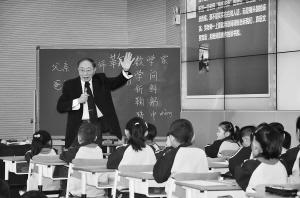 全国著名语文特级教师贾志敏在公开课上给学生们讲授语文课文《爸爸的老师》。 (石家庄市语委办提供)