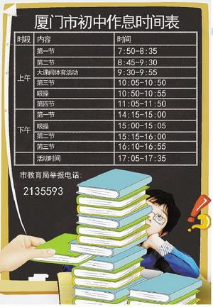 昨日下午,市教育局召集各区教育局、直属校、以及岛内区属初中校,要求从下周一开始,统一执行规范的初中作息时间表,并公布举报电话,供学生家长对违规学校和老师进行举报。这份 减负“鸡毛令”,是针对10月中旬市教育局减负检查发现问题而下发的。这次“减负令”只能算是再次重申,但是,它也有不同之处,即对试图钻空子来增加学生学习负担的行为,更加“严防死守”。我市在春季学期开始义务教育阶段新一轮的减负,有两大意外。一是和以往几轮减负相比,它最见成效;二是,教育主管部门居然是动真格,昨日下发的这份作息时间表也显示了决心。