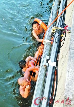 上岸 一位城管和三位保安利用江边救生圈跳江救人。记者苏俊杰、何瑞琪 通讯员蒋树龙 摄