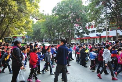 学校门前车辆多 老师为保安全“封路”送学生(图)