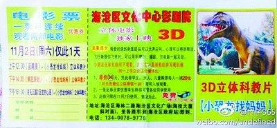 冯先生是海沧天心岛小学一年级学生的家长。上周五,他家孩子放学时在校门口收到一张电影“优惠券”。孩子说,是一个老师模样的阿姨发的。“优惠券”上写着,海沧区文化中心影剧院独家上映3D立体科教片,并提醒“小朋友在家长陪同下观看,请学生认真观看后并写观后感,周一上学交班主任做评比”。“优惠券”给出的优惠是:原价50元,凭此券学生、大人、儿童购票每人一律20元。