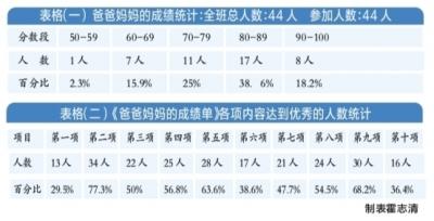 表(一)显示,能成为孩子心中优秀的父母全班只有8人,占18.2%,合格的父母17人,占38.6%。