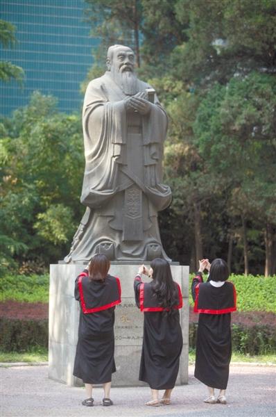 中国人民大学几名毕业生在离校前“拜别”孔子像。新京报记者 薛珺 摄