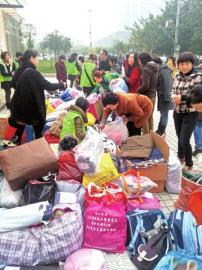 家长和孩子们踊跃捐衣服。