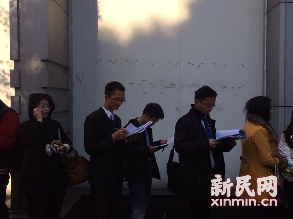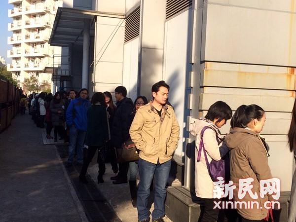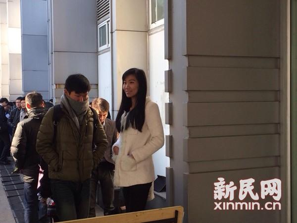图说:衣着单薄的求职女生,早上7点就冒着严寒等候在招聘会室外。新民网 记者 李欣 摄
