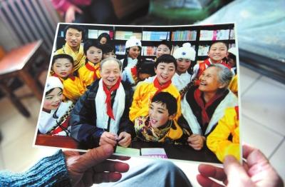 老人展示在希望学校和孩子们互动时的照片。