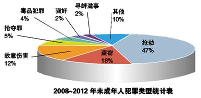 财产型犯罪和暴力型犯罪占多数,暴力型犯罪呈现上升趋势。在广东法院2008年至2012年判处的44508名未成年罪犯中,犯罪人数最多的是抢劫罪(20774人),其次是盗窃罪(8018人),再次是故意伤害罪(5616人),绝大多数是财产型犯罪或暴力型犯罪。