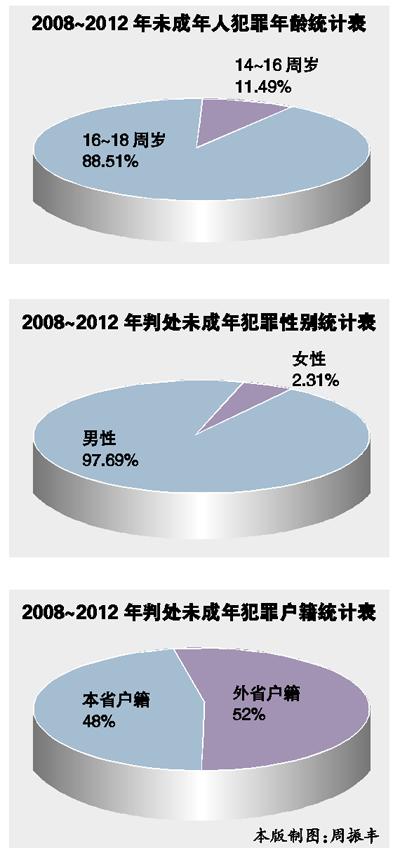 2008年至2012年判处的全部未成年罪犯中,男性占97.69%,是女性的42倍。